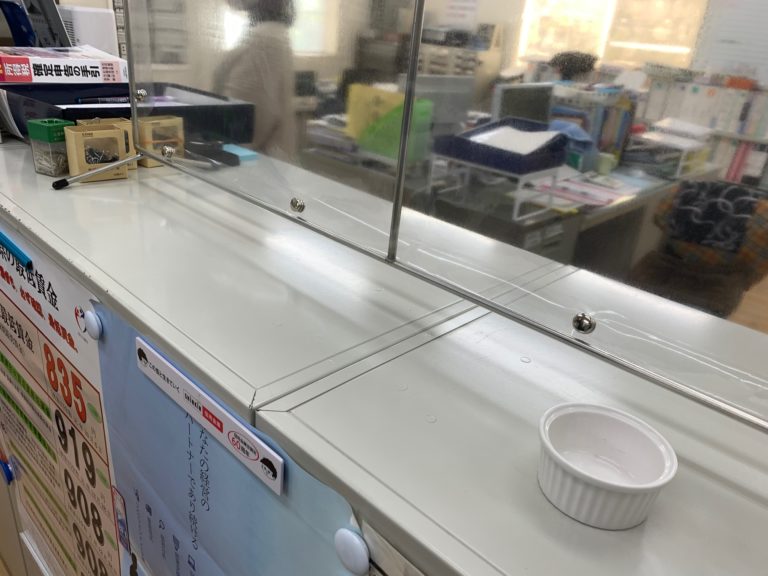 吉岡町商工会に[仕切りくん]卓上型を納品させていただきました。 受付カウンターの上に置くだけです。 下の隙間から 書類の受け渡しがスムーズに出来ます。